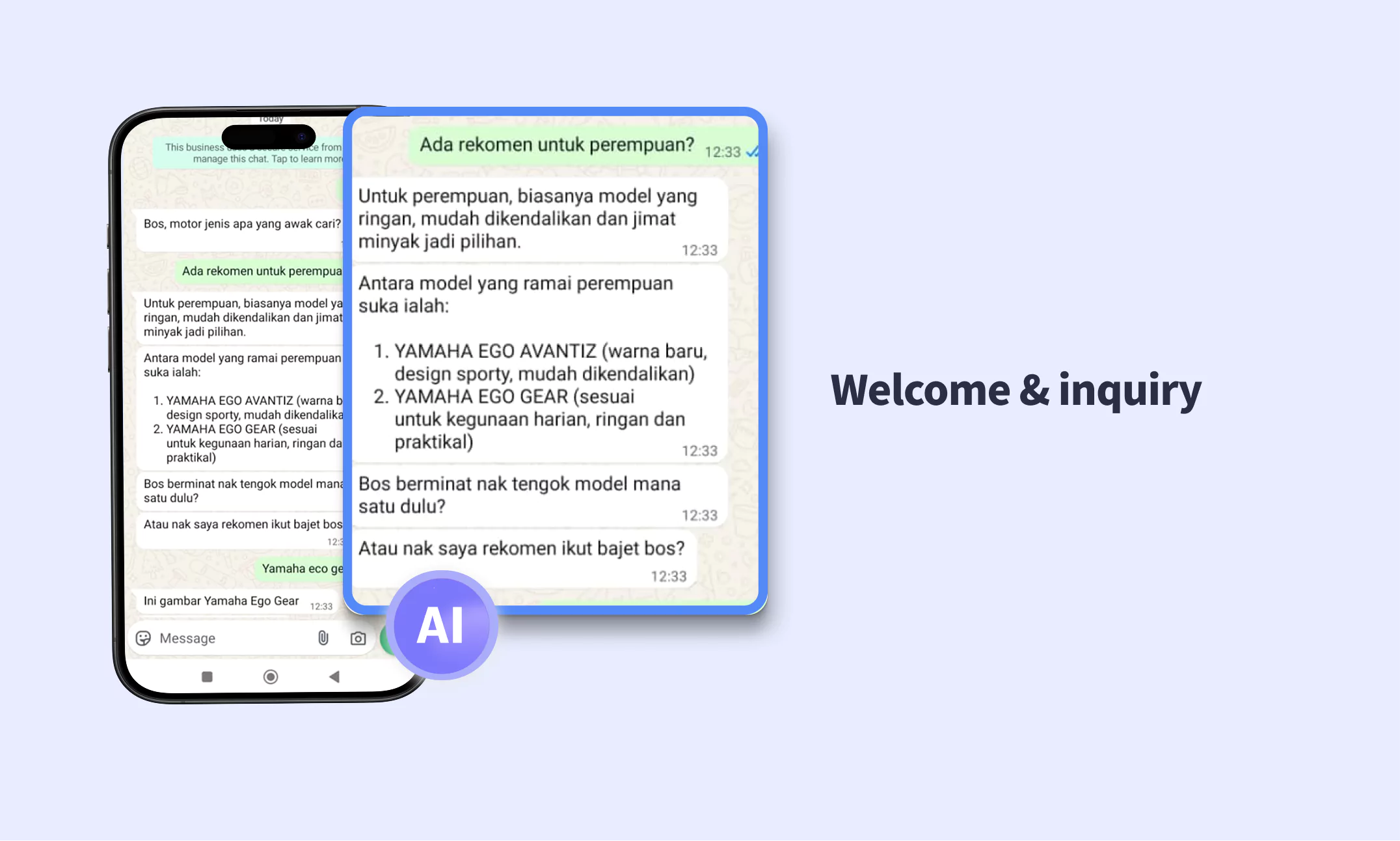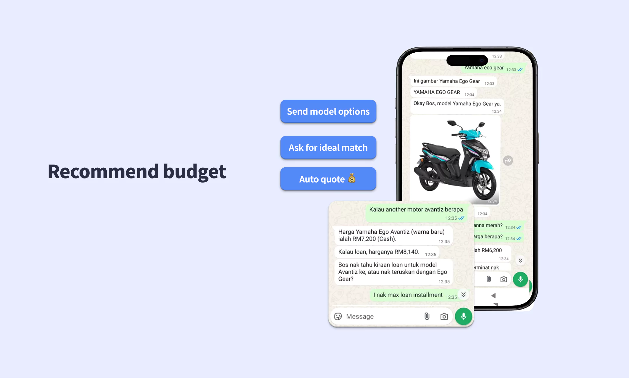 Buying a motorcycle no longer needs to be stressful or slow. With an AI Chatbot, motor dealers can offer a modern, guided, and friendly experience — all via WhatsApp, website, or Messenger. .