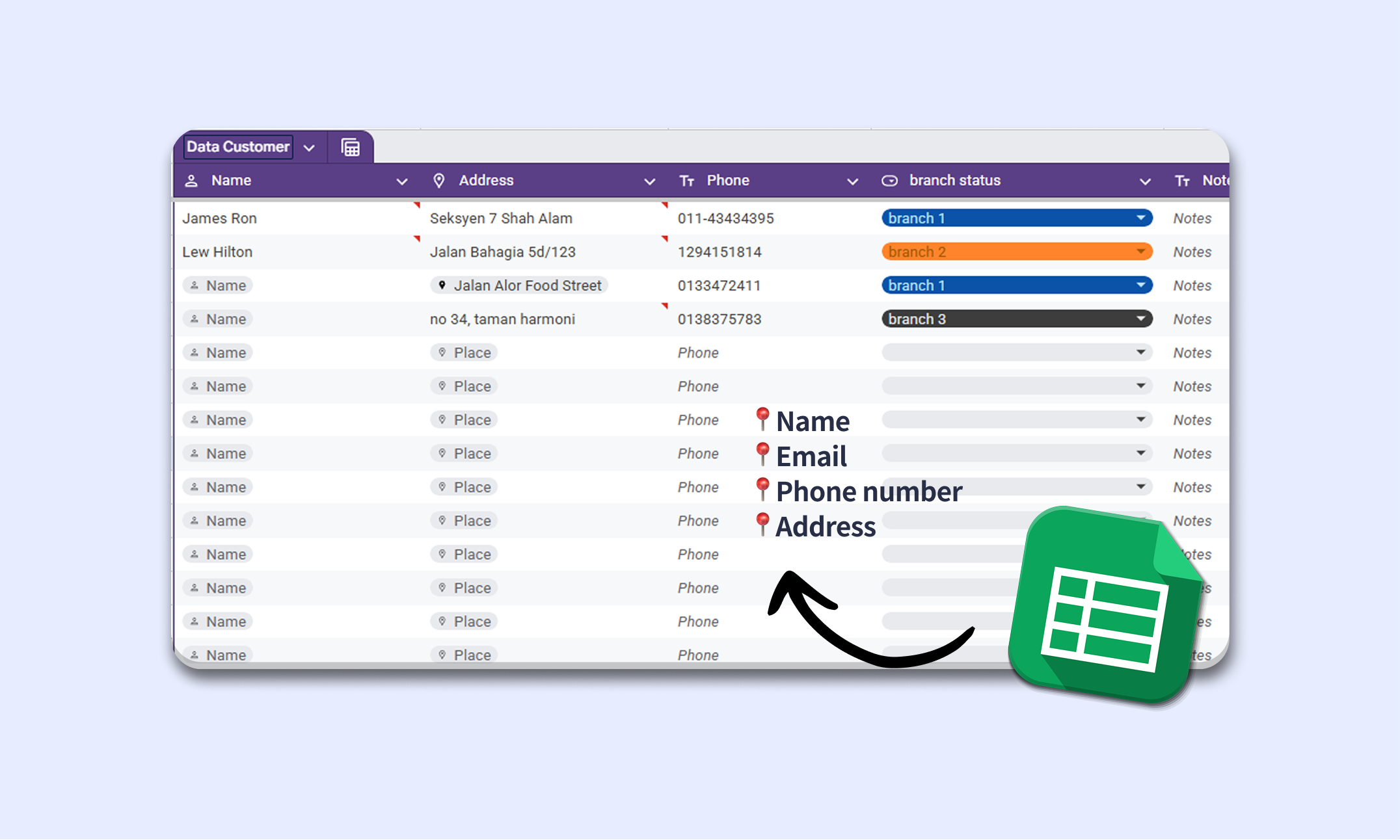 AI compares the user’s input with your preloaded branch data (stored in Google Sheets, CMS, or CRM)