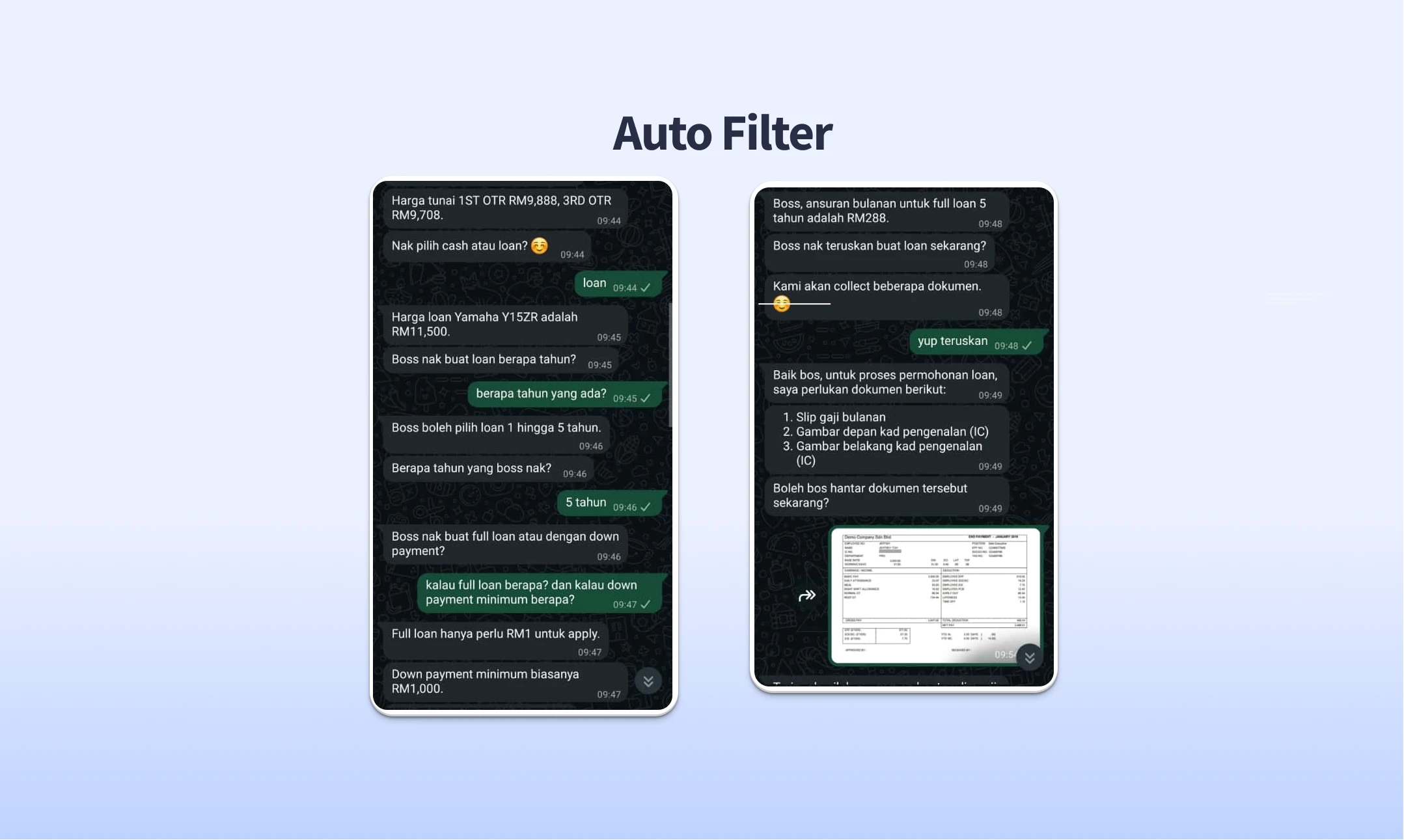 The chatbot doesn’t just chat. It understands your business. It automatically filters leads that don’t fit your loan or model requirements — leaving you with only buyers who can afford and are ready to purchase.