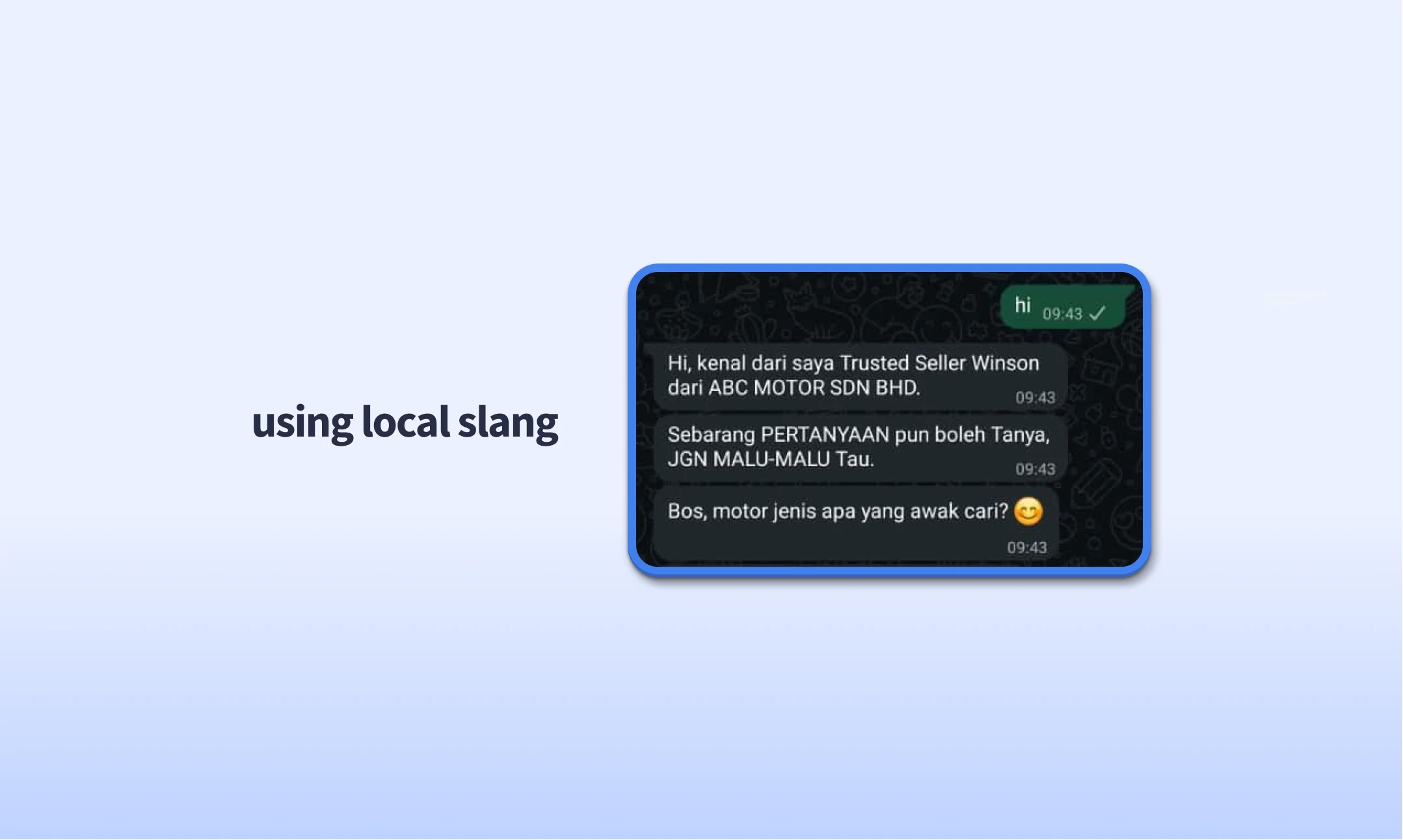 Our chatbot speaks like a real salesperson (even can add local slang if you want 😎). No robotic tone — just friendly, engaging, and persuasive messages that make customers reply faster.